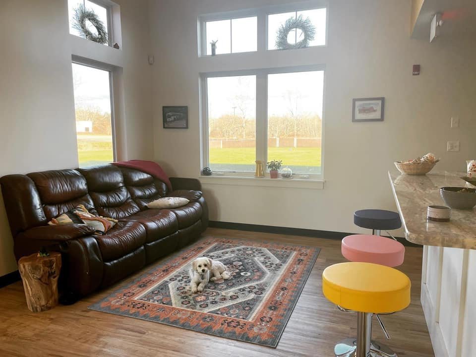 The building has such lovely energy and the big room is PERFECT for movement and expression. Looking out the big windows at the lush grassy fields and blue sky while we dance or during a workshop, adds such a beautiful element to the experience of being in the space. There is an abundance of light in the room and it is a very comfortable space to spend time in.